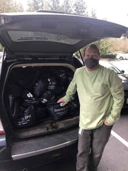 Essentials First provided 150 street kits and a 150 hygiene kits to Evergreen Goodwill of Northern Washington in an effort to provide hygiene relief to individuals and families who are enrolled in Goodwill training programs. Scott Rice, Regional Volunteer Program Manager, Evergreen Goodwill of Northwest Washington is pictured here picking up kits from our Bellevue office.